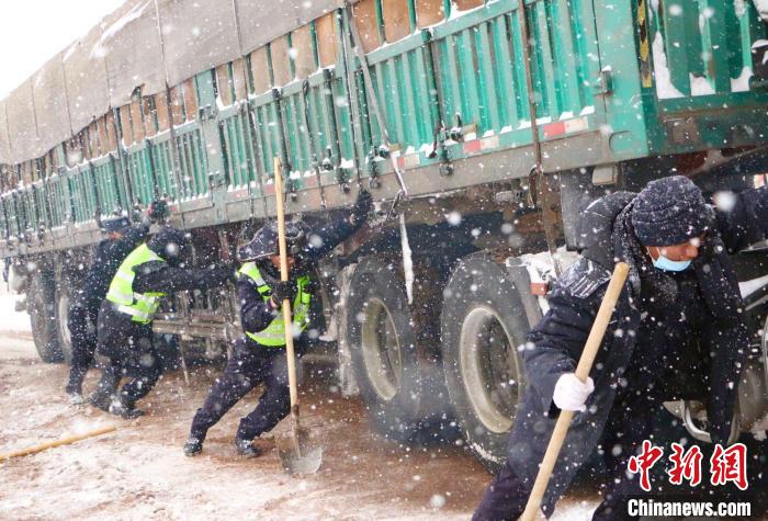 圖為2021年4月,國道109線安多段大雪致車輛通行困難,那曲市安多縣公安民警進行除雪保通。資料圖 西藏自治區(qū)公安廳供圖