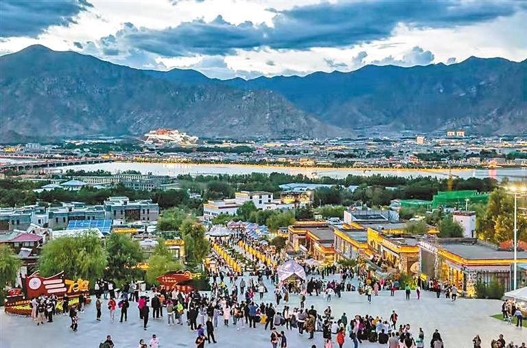 夜色漸濃,位于拉薩河畔寶瓶山上的文成公主劇場(chǎng),被成片的火燒云染成了耀眼的橙,熙攘人潮,暮色流光,劇場(chǎng)下方的慈覺林藏院風(fēng)情街更是人潮涌動(dòng)。近年來,隨著冬季旅游政策的不斷推進(jìn),有效促進(jìn)了西藏全季、全時(shí)旅游的發(fā)展,而處于夏季旅游黃金時(shí)期的西藏旅游則更加火爆。作為西藏文化旅游的靚麗名片,《文成公主》實(shí)景劇引來了更多游客前來觀看。