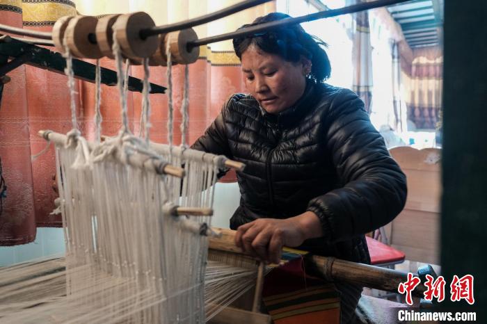在他們家,記者看到了幾臺傳統(tǒng)藏式織機(jī),玉珍說,這是用于織邦典(藏式毛織圍裙)的工具。2016年開始,玉珍運(yùn)用編織技藝帶領(lǐng)村里的婦女共同成立了一個小規(guī)模的編織廠,“我們的羊毛線是自己染的,織出來的邦典質(zhì)感更好,也不愁銷路,為家里增收不少。”她說,編織讓大家實(shí)現(xiàn)了家門口就業(yè),也不耽誤家務(wù),村里人很樂于接受。