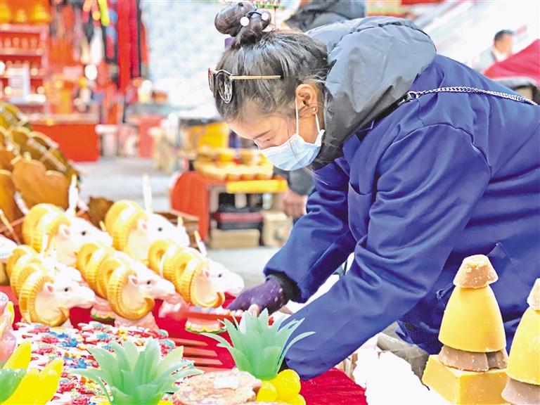 漫步八廓商城,從一樓到三樓,攤位整齊有序。風(fēng)干的牛羊肉、色彩斑斕的“卡賽”醉人的青稞酒……從節(jié)日用品、服裝飾品到干果零食,各式各樣的年貨琳瑯滿目。