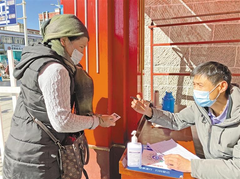 八廓商城市場部部長卓嘎介紹說:“為廣大市民提供一個安全、祥和的購物環(huán)境,我們在商場設(shè)有5個進(jìn)出口,每個進(jìn)出口都需掃行程碼、測量體溫后才可進(jìn)入。因為有些老人沒有智能手機(jī),無法掃健康瑪,我們會登記姓名、身份證號、聯(lián)系方式。并且在增加的攤位旁增設(shè)消防器材,不定時巡邏?!?/p>