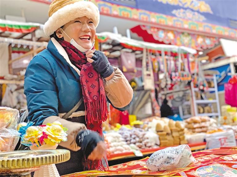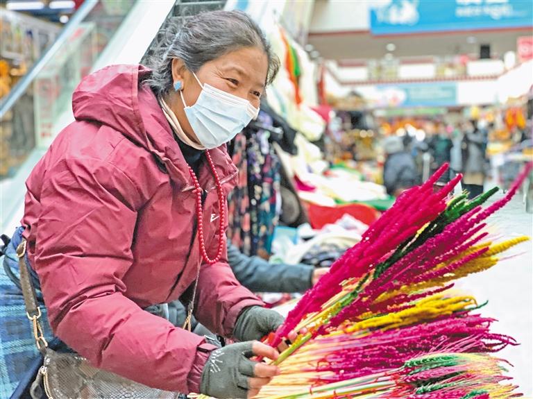 近年來,新春佳節(jié)貼“年紅”的傳統(tǒng)習(xí)俗日漸走進(jìn)圣城雪域。如今,無論城市還是農(nóng)村,幾乎家家戶戶都會在門上貼藏文春聯(lián),增加喜慶的節(jié)日氣氛。來自墨竹工卡縣的平措卓瑪正在八廓商城年貨攤位前整理著春聯(lián),去年已經(jīng)擺過一次年貨攤位的她,在1個月的時間里掙到了8000元。“今年攤位抽簽時,心里特別緊張,怕位置不好,沒想到抽到了中間的好位置,這里采光足,紅彤彤的春聯(lián)在陽光下更好看了。新的一年,希望大家幸福安康、平安吉祥!”平措卓瑪懇切地說。