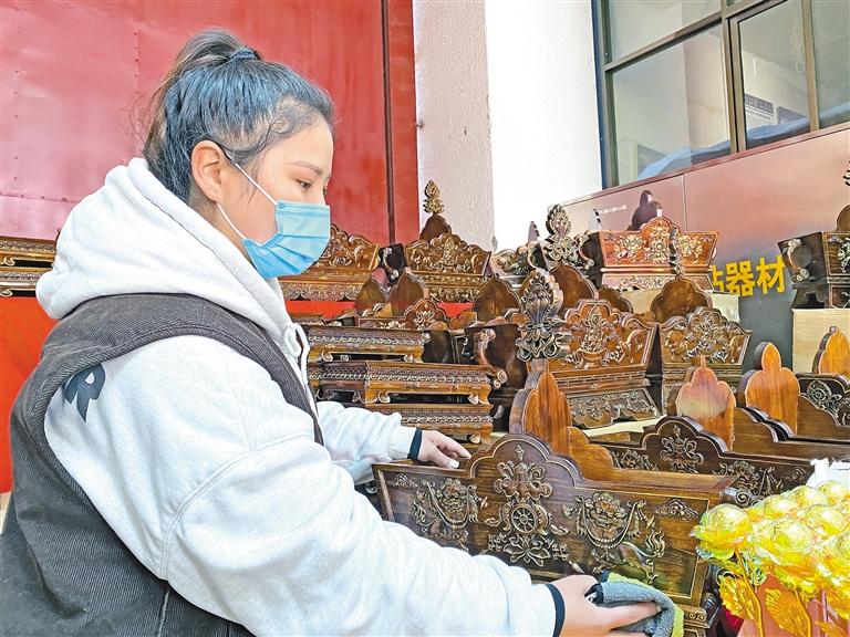 來自山南市貢嘎縣的拉吉帶著自家生產(chǎn)的“切瑪盒”第2次來到八廓商城年貨市場。“由于是自家生產(chǎn),所以我們自主設(shè)計了一款線條稍微簡約的‘切瑪盒’;還有一款傳統(tǒng)線條與圖案的‘切瑪盒’。在顏色上,我們選擇了較為持重的深色,這樣的顏色大氣沉穩(wěn),許多市民非常喜歡,兩款售價都是380元?!崩榻B道。