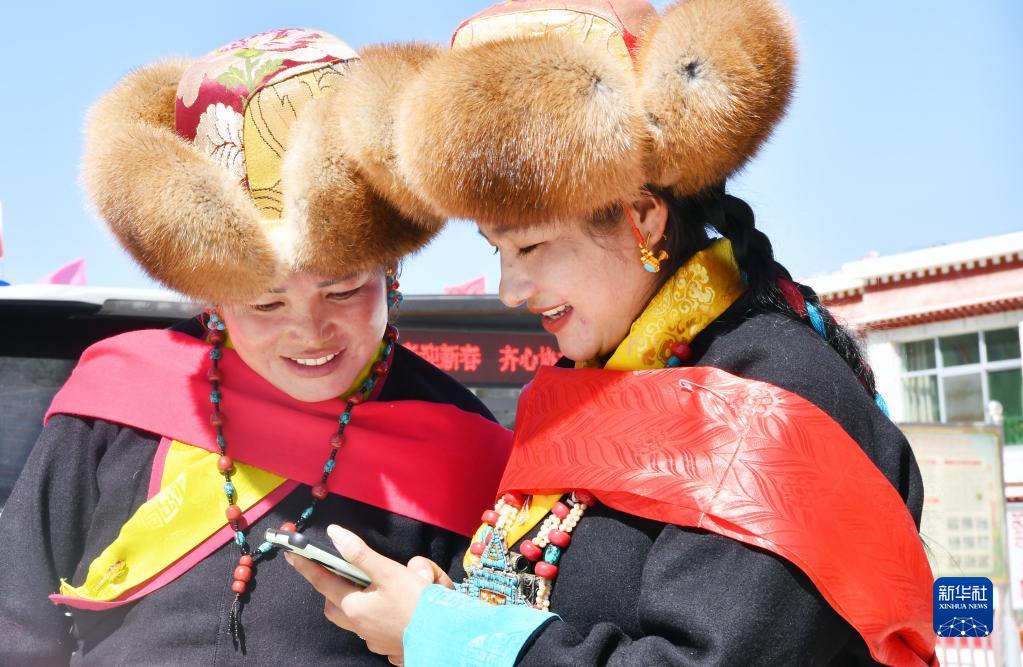 3月3日,西藏山南市貢嘎縣崗堆鎮(zhèn)群眾通過(guò)智能手機(jī)向外地的朋友拜年。新華社記者 覺(jué)果 攝