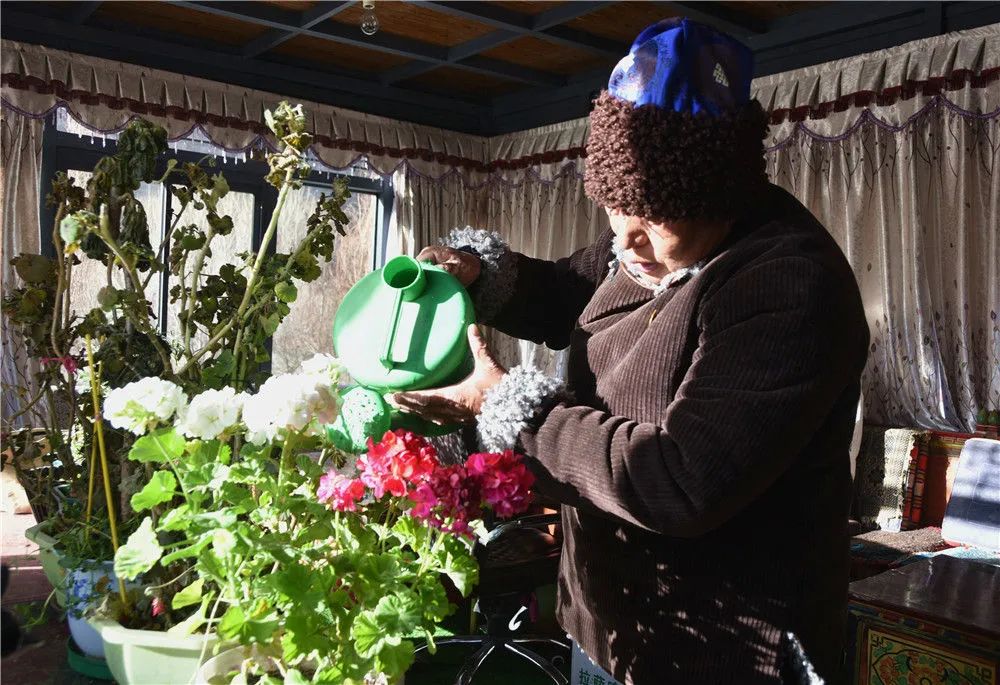 西藏洛扎縣嘎波社區(qū)扎麥村村民達瓦次仁在給陽光房里的盆栽澆水(1月19日攝)。新華社記者 陳尚才 攝