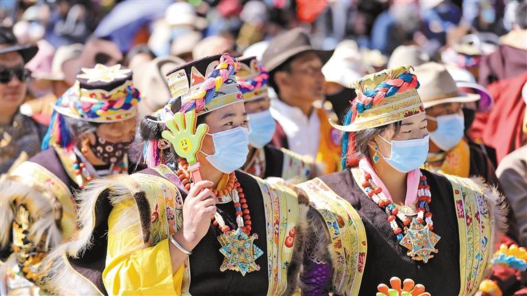 圖為在第七屆“尼屋桃花節(jié)”開幕式上,身穿民族服裝的當(dāng)?shù)厝罕姟?記者 萬(wàn)靖 通訊員 平措卓瑪 攝