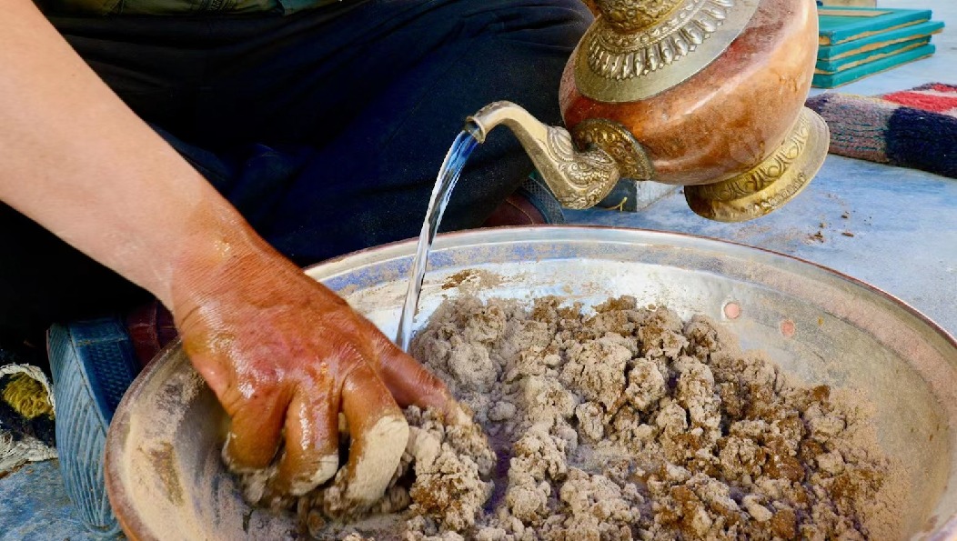 靜謐的午后,空氣里都是柏木的清香。次仁多吉盤(pán)坐在遮陽(yáng)傘下,伴著周?chē)宕嗟牧魉?、水磨聲,輕揉著手中的香泥。隨后他用手一抓,迅速將香泥擠進(jìn)帶孔的牛角器中,身子微微前傾,手指用上巧勁,一根根藏香便排在紗網(wǎng)之上。