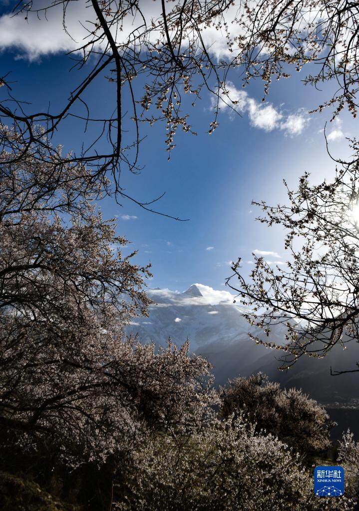桃花掩映下的南迦巴瓦峰(4月13日攝)。新華社記者 晉美多吉 攝