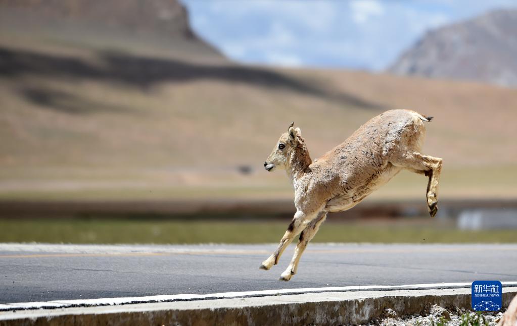 一頭藏原羚在那曲市申扎縣的鄉(xiāng)村道路上奔跑(2017年6月23日攝)。新華社記者 覺果 攝