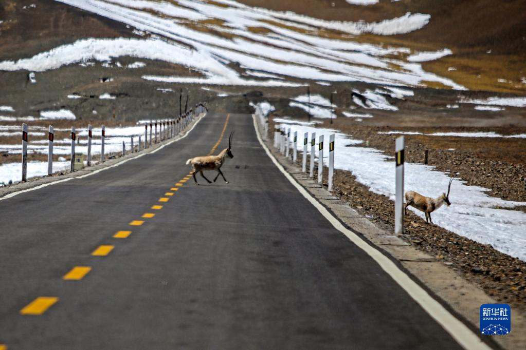 兩頭藏羚羊在阿里地區(qū)日土縣橫穿公路(4月9日攝)。新華社記者 姜帆 攝