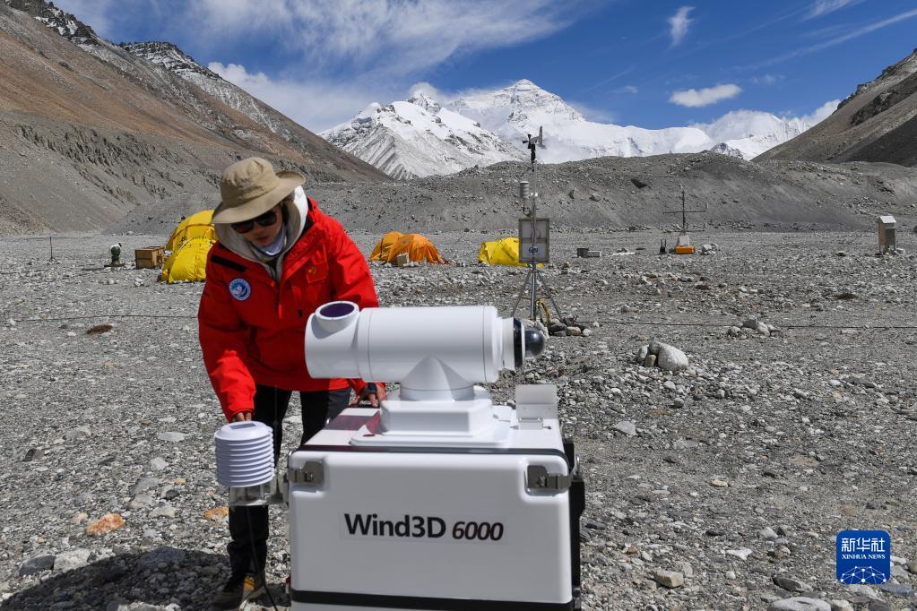 5月3日,在珠峰登山大本營(yíng),科研人員檢查臭氧通量裝置運(yùn)行情況。新華社記者 姜帆 攝