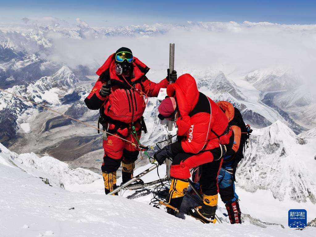 1個多小時后,氣象站架設(shè)成功。此時,部分隊員已經(jīng)登上頂峰開展雷達測量雪深、采集冰雪樣品等科研工作。德慶歐珠說,13名科考隊員全部登頂時,珠峰南坡的云慢慢爬上來,隊員們仿佛站在天上,比云還高。