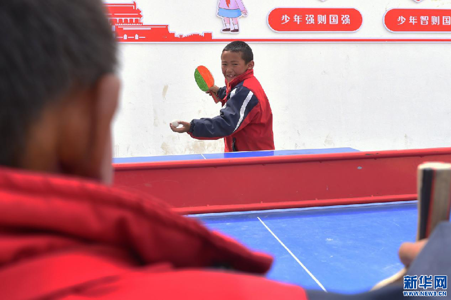 多油村中心小學的學生在課余時間玩乒乓球(4月21日攝)。新華網(wǎng) 旦增努布攝
