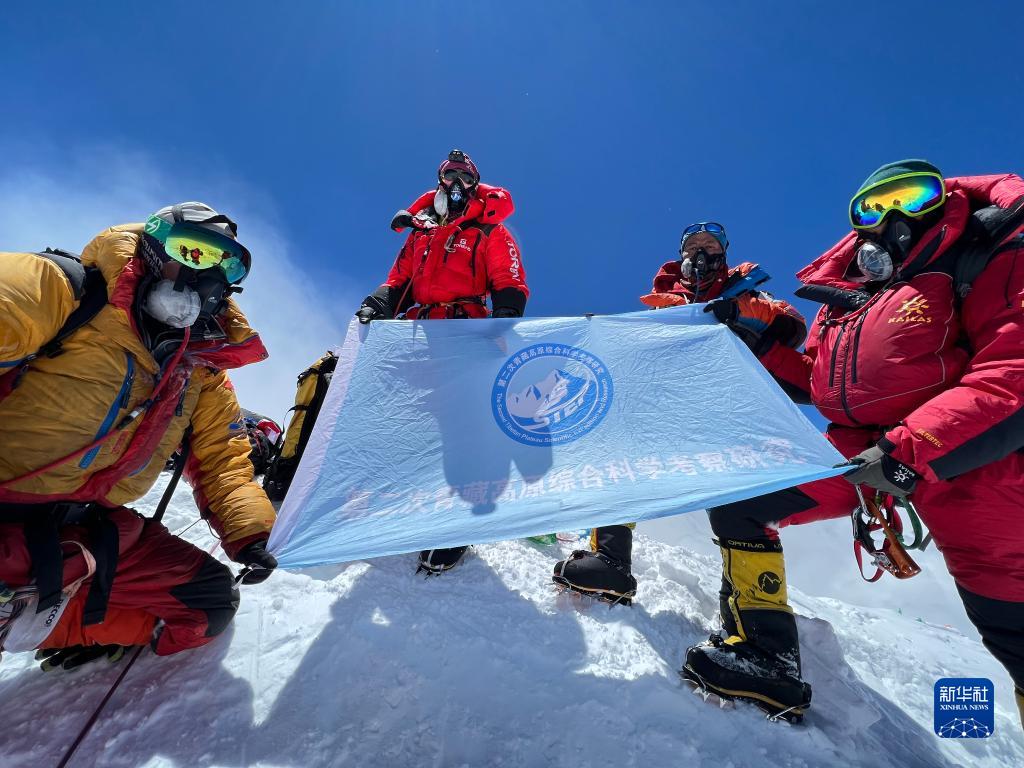 在珠穆朗瑪峰峰頂,科考隊(duì)員展示第二次青藏高原綜合科學(xué)考察研究旗幟。