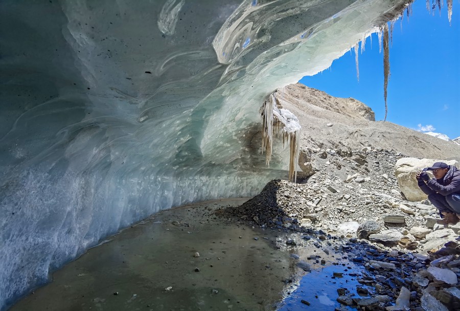 冰川與污染物小組在東絨布冰川觀察測量(5月5日攝,手機照片)。新華社發(fā)(受訪者供圖)