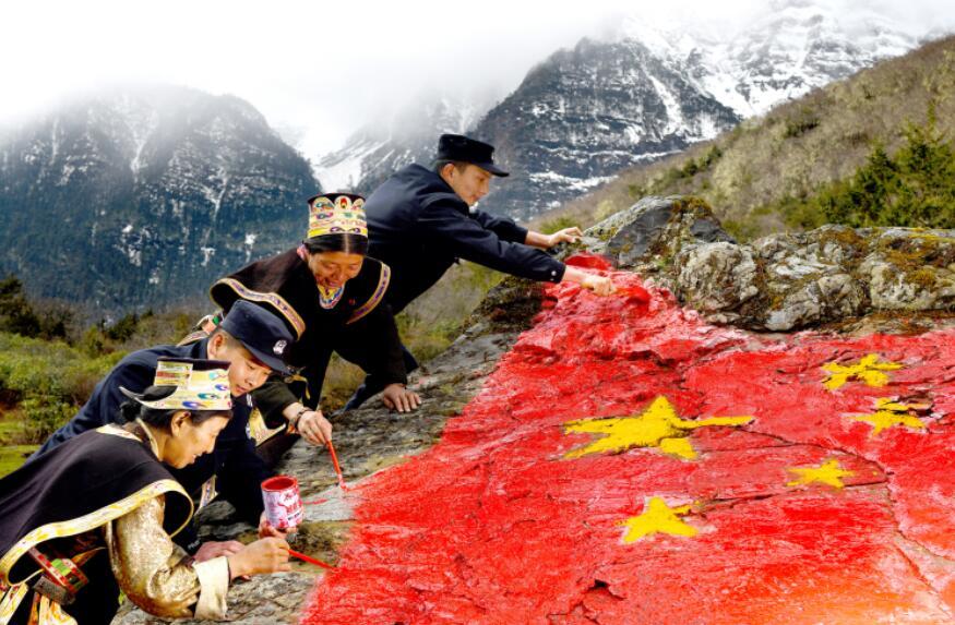 圖為玉麥邊境派出所戍邊民警與“時(shí)代楷模”獲得者卓嘎、央宗姐妹共同描繪國(guó)旗。蔣美靈 攝