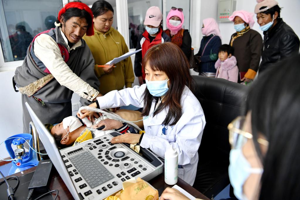 江蘇泰州市人民醫(yī)院援藏醫(yī)生在拉薩市當(dāng)雄縣人民醫(yī)院為一名兒童做檢查。新華社記者李鍵攝