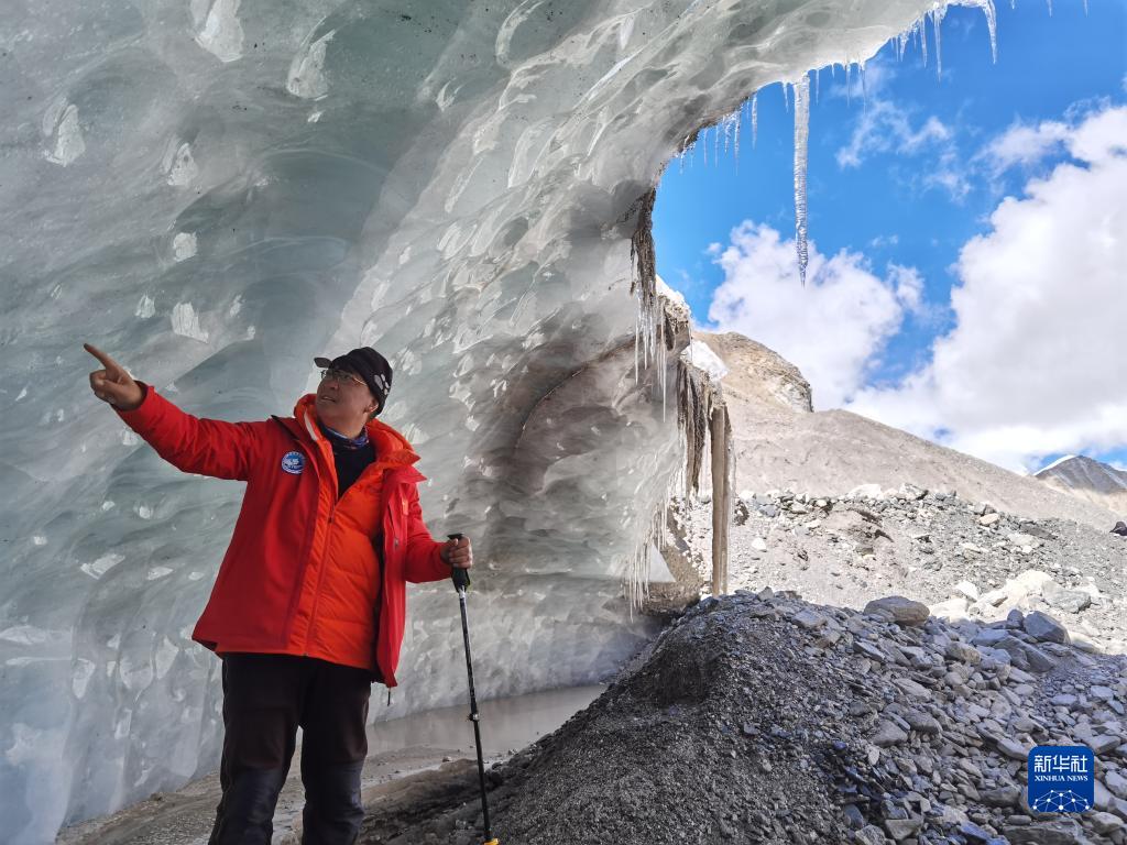 中國科學院西北生態(tài)環(huán)境資源研究院副院長康世昌在珠峰東絨布冰川區(qū)域考察(5月8日攝)。新華社發(fā)