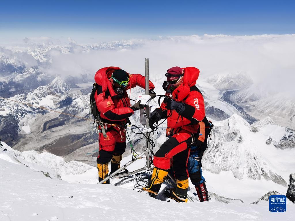5月4日,德慶歐珠帶領的登頂小組科考隊員,在珠峰海拔8830米處架設世界海拔最高自動氣象站,建成珠峰梯度氣象觀測體系;在峰頂首次利用高精度雷達測量冰雪厚度,并采集了峰頂冰雪樣品。