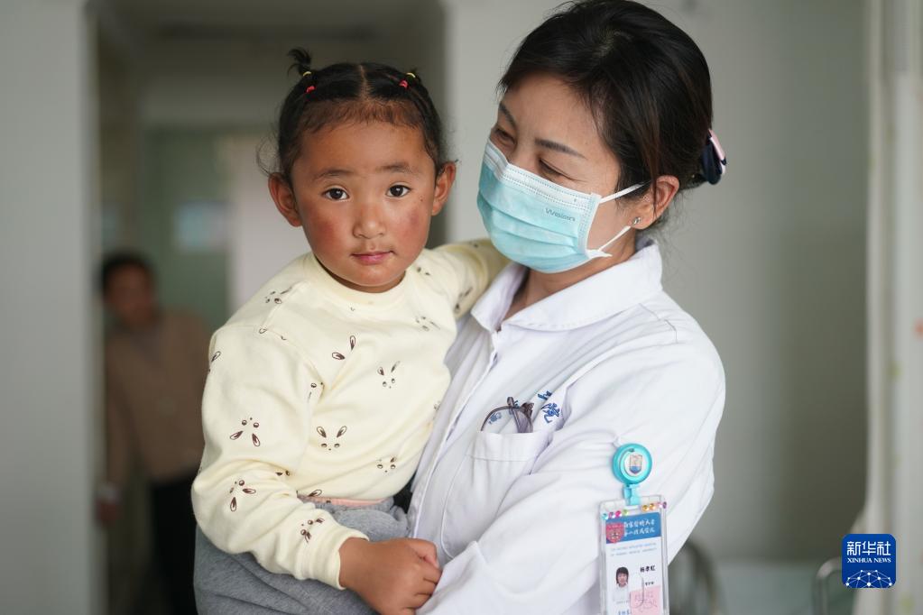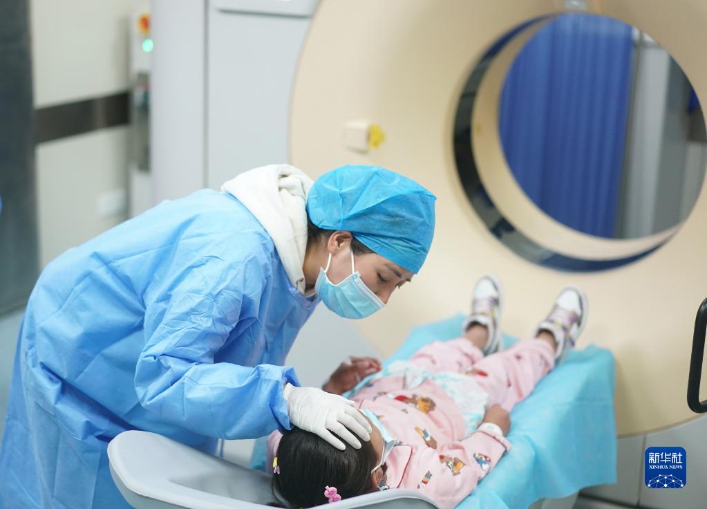 護(hù)士在安慰準(zhǔn)備接受CT增強(qiáng)檢查的小患者達(dá)瓦卓瑪(5月12日攝)。
