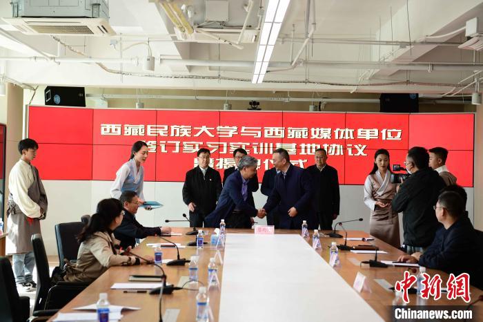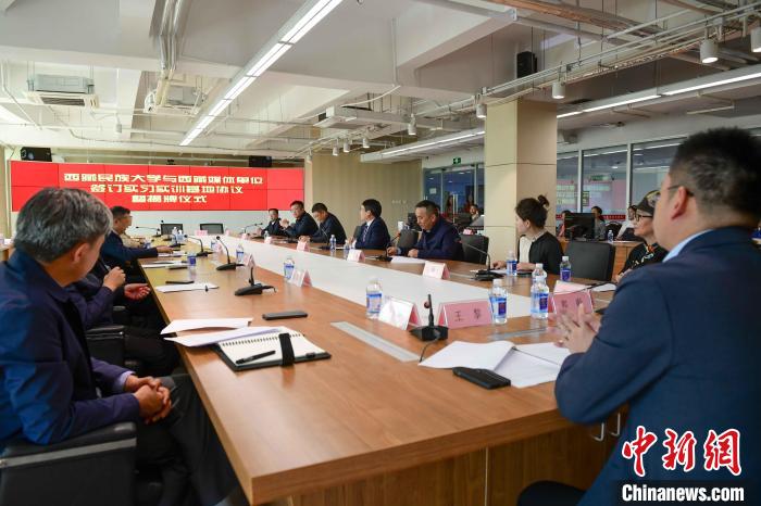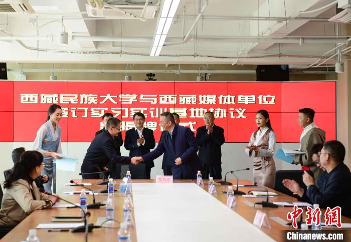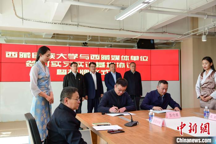 5月27日,西藏民族大學與西藏日報社、西藏廣播電視臺、人民網西藏頻道、中國新聞社西藏分社、中國西藏網西藏記者站等媒體單位簽訂實習實訓基地協議暨揭牌儀式在西藏日報舉行。