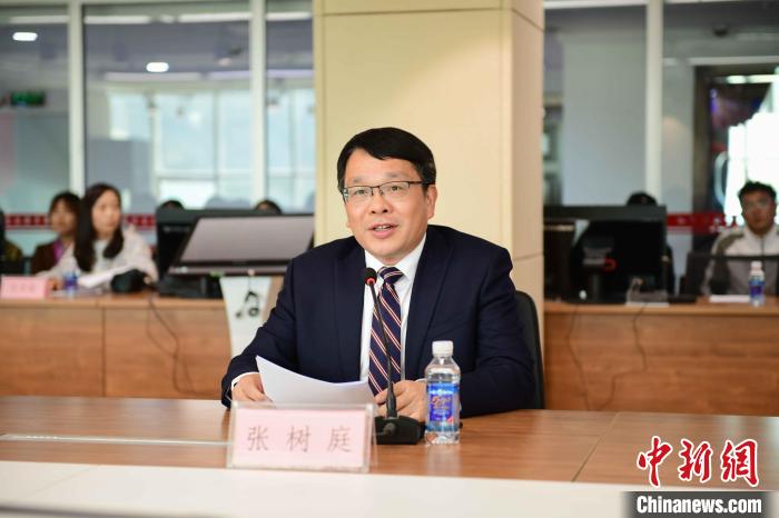 圖為西藏民族大學黨委常委、副校長,中國傳媒大學黨委常委、副校長張樹庭在簽約儀式上講話。 貢嘎來松 攝