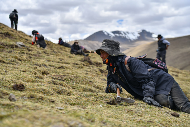 5月25日,牧民在采集蟲草。新華社記者 晉美多吉 攝