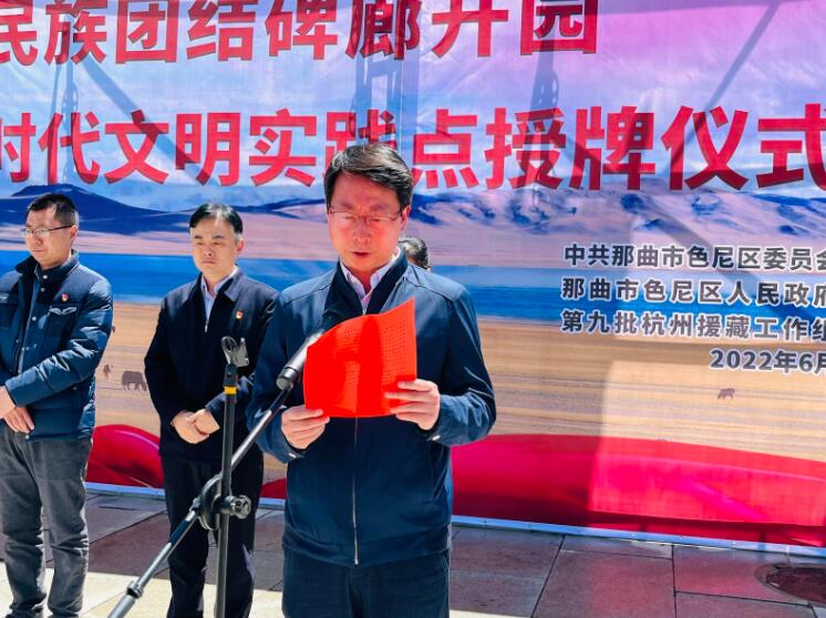 為鑄牢中華民族共同體意識(shí),助力色尼區(qū)新時(shí)代文明實(shí)踐和創(chuàng)建全國(guó)民族團(tuán)結(jié)進(jìn)步模范區(qū)創(chuàng)建工作,6月11日,由杭州援藏工作組組織修建完成的西藏首個(gè)民族團(tuán)結(jié)碑廊在西藏自治區(qū)那曲市色尼區(qū)正式開(kāi)園。那曲市政府黨組成員、副市長(zhǎng),色尼區(qū)委書(shū)記李東出席儀式,色尼區(qū)有關(guān)單位民族團(tuán)結(jié)創(chuàng)建工作專(zhuān)干、新時(shí)代文明實(shí)踐中心志愿者以及僧尼群眾代表60余人參加儀式?! ?/p>