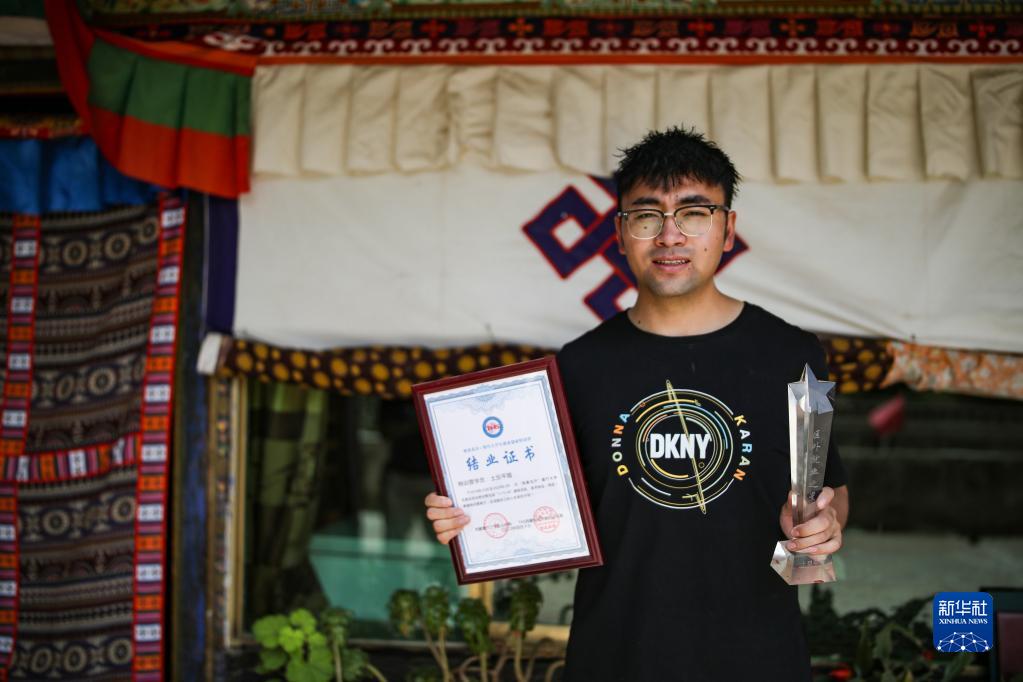 “格?;ㄩ_”大學生就業(yè)創(chuàng)業(yè)特訓營學員、江蘇今世緣酒業(yè)股份有限公司甘青藏大區(qū)業(yè)務經理土旦平措展示特訓營結業(yè)證書和“區(qū)外就業(yè)之星”獎杯(2022年6月23日攝)。新華社記者 姜帆 攝