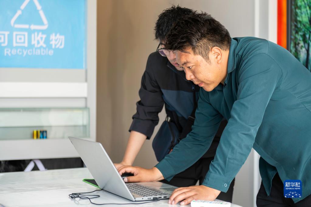 “格?;ㄩ_”大學生就業(yè)創(chuàng)業(yè)特訓營學員、西藏墨竹工卡格?;ㄩ_大學生創(chuàng)業(yè)管理有限公司創(chuàng)辦人頓珠次仁(右)在墨竹工卡縣生活垃圾分類宣教中心講解垃圾分類常識(2022年6月23日攝)。新華社記者 周荻瀟 攝