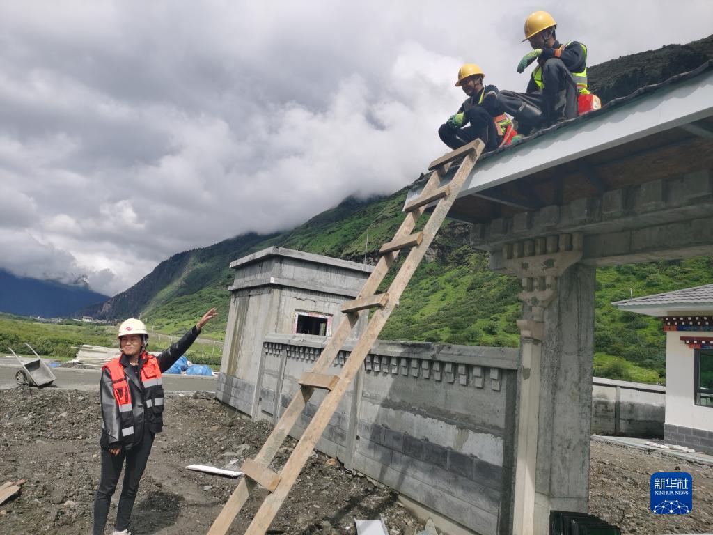 “格?;ㄩ_”大學生就業(yè)創(chuàng)業(yè)特訓營學員、西藏藏建科技股份有限公司職員阿吉卓瑪(左)在施工現(xiàn)場工作(2022年6月28日攝)。