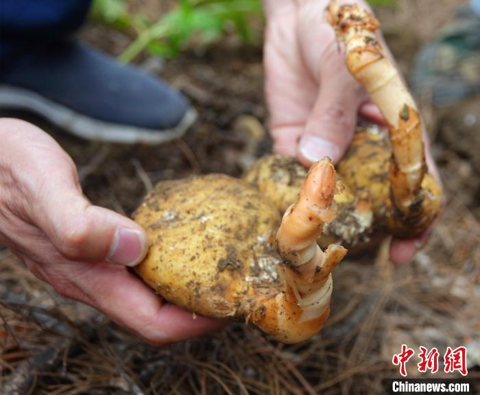 圖為工作人員展示藏天麻種植基地?fù)嵊奶炻椤!∪轿木?攝
