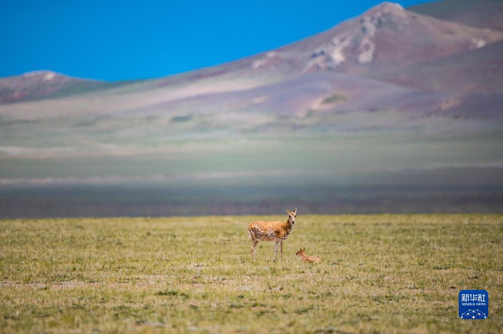 在羌塘國家級自然保護區(qū),一只母藏羚羊在看護其幼崽(7月11日攝)。新華社記者 周荻瀟 攝