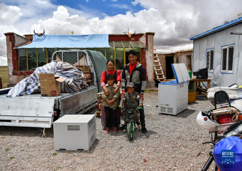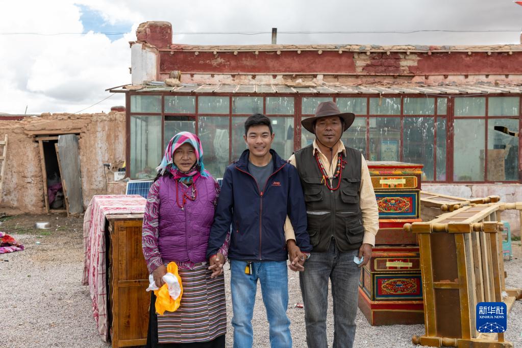 雙湖縣多瑪鄉(xiāng)果根擦曲村牧民貢覺多吉(中)和父母在老房子前合影。他們搬運(yùn)的家具不多,準(zhǔn)備在新家添置新家具(7月12日攝)。新華社記者 周荻瀟 攝