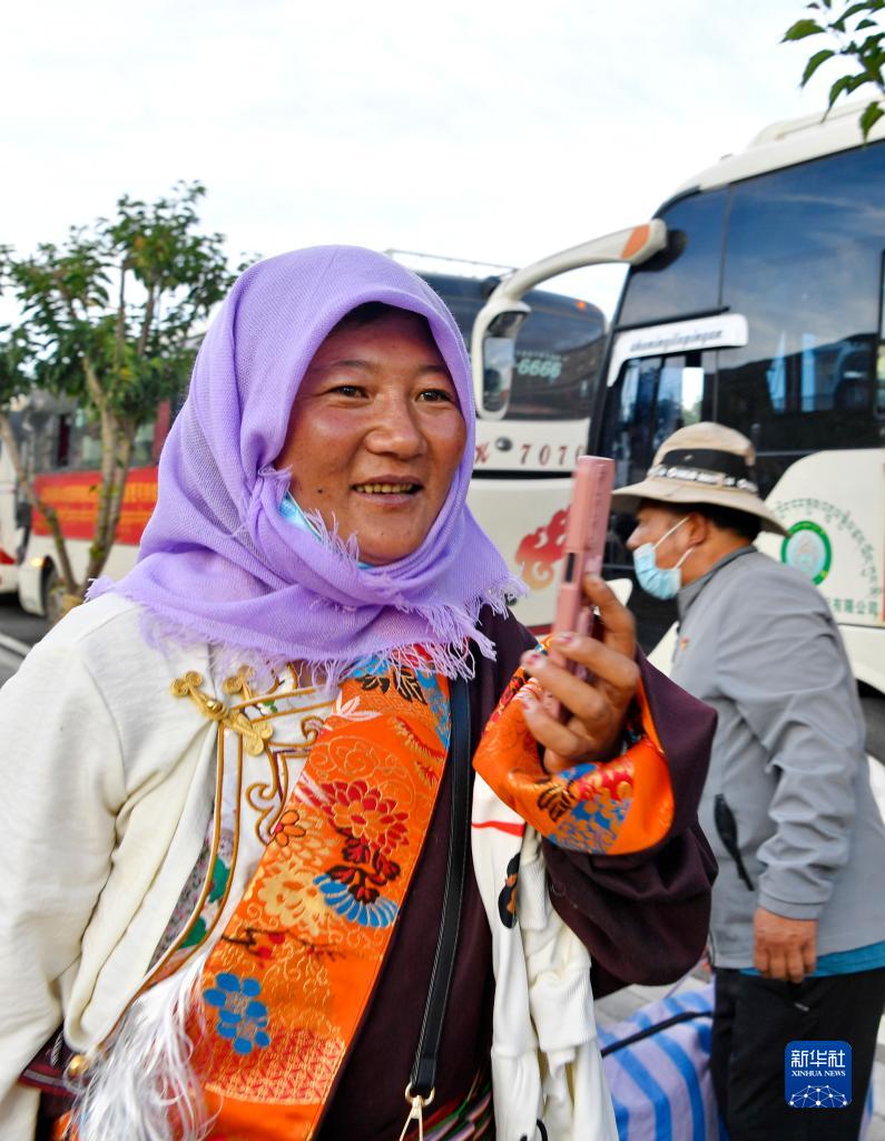 剛剛抵達(dá)森布日安置點(diǎn)的雙湖縣牧民在給親朋打電話報平安(7月19日攝)。新華社記者 張汝鋒 攝