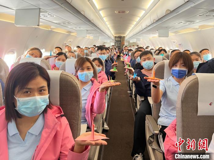 東航機(jī)組制作了寓意“美好、希望、祝?!钡那Ъ堹Q送給援藏醫(yī)護(hù)隊(duì)員,希望醫(yī)護(hù)隊(duì)員們平平安安歸來(lái),祝福自治區(qū)各族同胞早日戰(zhàn)勝疫情。