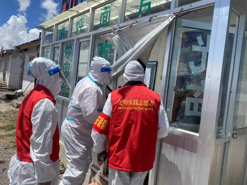那曲市安多縣帕那鎮(zhèn)新時(shí)代文明實(shí)踐所志愿者對商鋪進(jìn)行消殺。圖片由那曲市文明辦提供