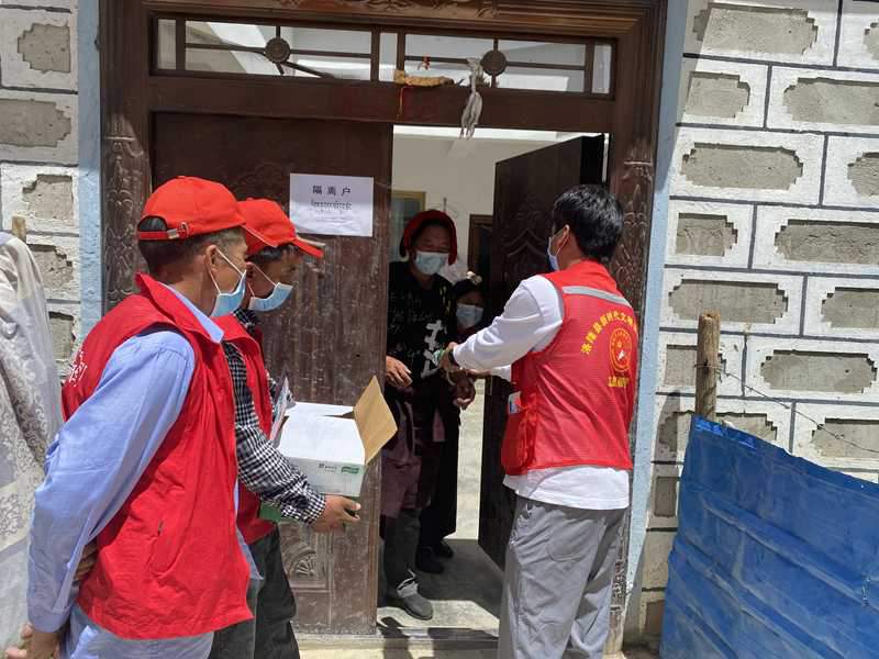 洛隆縣孜托鎮(zhèn)德康社區(qū)新時(shí)代文明實(shí)踐志愿者為社區(qū)居家隔離人員配送物資。圖片由昌都市文明辦提供