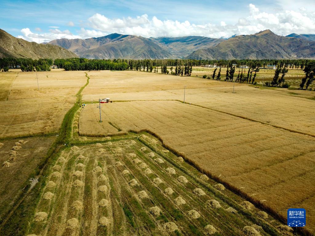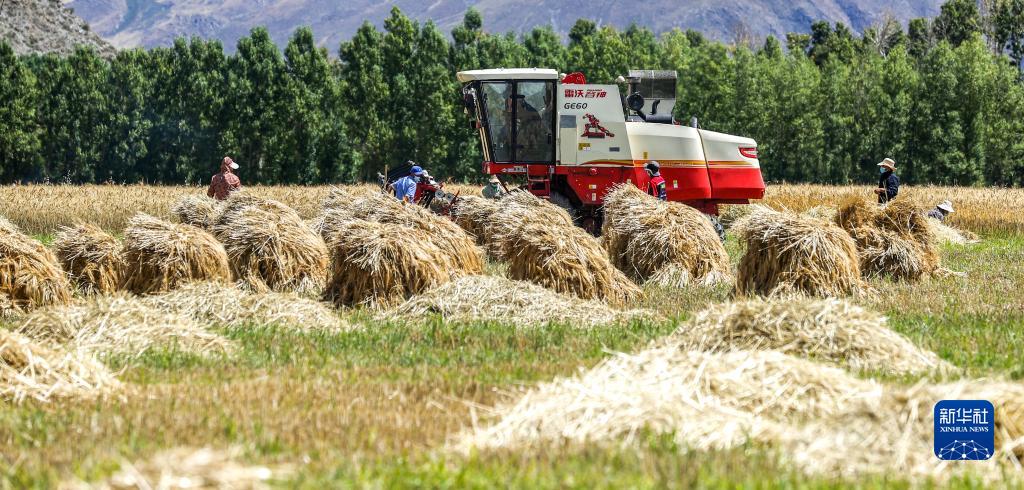 農(nóng)機(jī)合作社和收割工作隊(duì)在林周縣邊林鄉(xiāng)當(dāng)杰村玉沖組搶收小麥(9月6日攝)。新華社記者 姜帆 攝