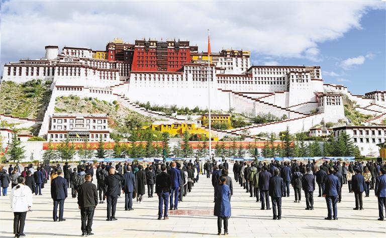 10月1日上午,西藏自治區(qū)慶祝中華人民共和國成立73周年“升國旗、唱國歌”儀式在拉薩布達拉宮廣場舉行。圖為儀式現(xiàn)場。記者 李洲 攝