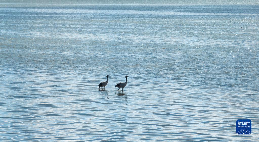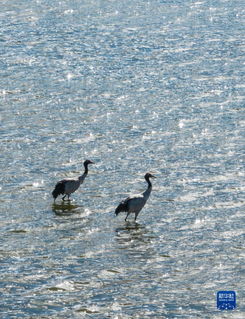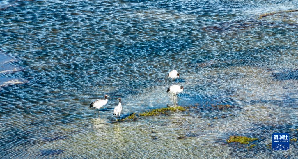 9月16日在多慶湖邊拍攝的黑頸鶴(無人機(jī)照片)。新華社記者 晉美多吉 攝