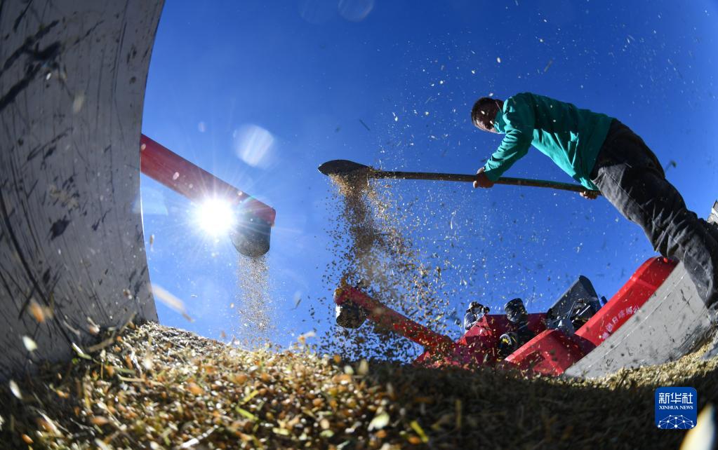 西藏日喀則市江孜縣熱索鄉(xiāng)努康村農機合作社的村民在整理收割機收獲的小麥(2022年9月19日攝)。新華社記者 晉美多吉 攝