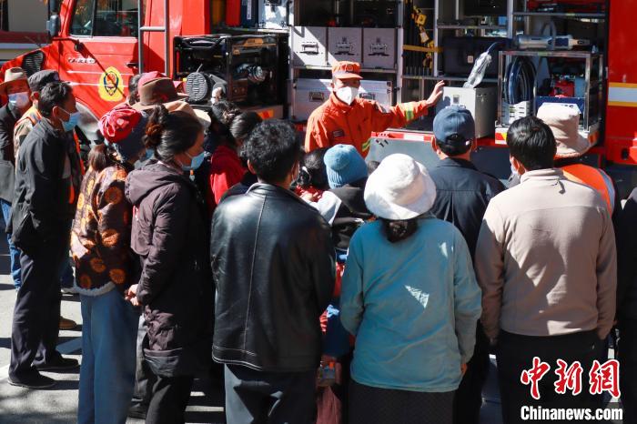 活動現(xiàn)場,消防員向民眾講解裝備操作?!≡卤?攝