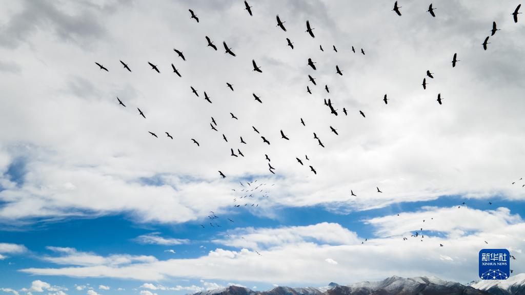 黑頸鶴在林周縣強嘎鄉(xiāng)上空飛翔(11月6日攝)。新華社記者 周荻瀟 攝