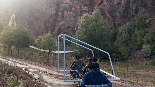 馬利鎮(zhèn)馬利村的村民騎著摩托車把球門運回村里。