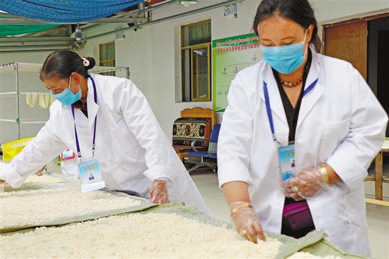 圖為聶榮縣色慶鄉(xiāng)雜瑪多種經(jīng)營合作社工作人員對(duì)奶渣進(jìn)行干燥處理。 記者 萬靖 謝偉 攝