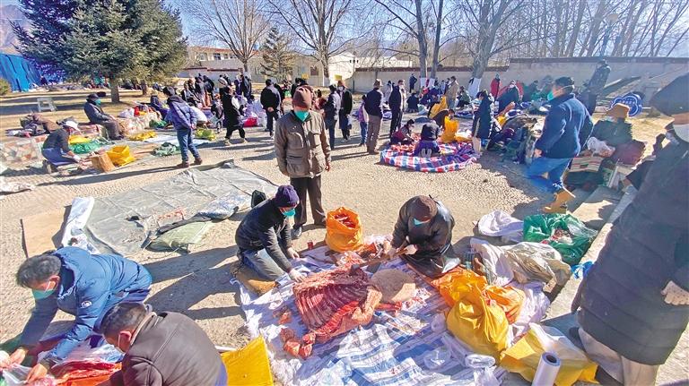 圖為市民在臨時銷售市場的切肉服務(wù)點處理購買的牛羊肉。記者 格桑倫珠 攝
