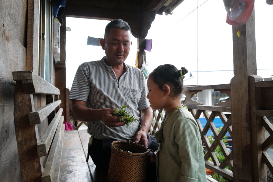采茶歸來的向嘎在和外孫女玩耍(2022年6月10日攝)。新華社記者 劉潁 攝