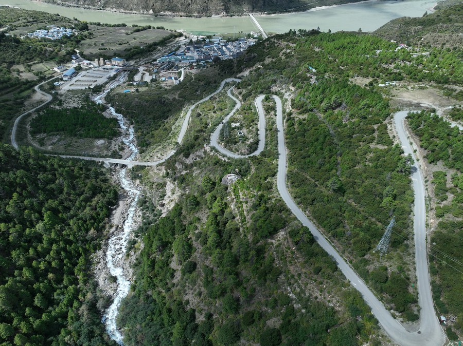 這是2022年9月30日拍攝的派墨公路派鎮(zhèn)起點路段(無人機(jī)照片)。新華社發(fā)(董志雄 攝)