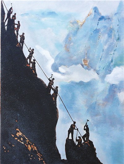 走近一幅畫作細(xì)看,寬近1米,高足1米有余,畫面是雪山,蛋殼、漆料等多種原料在畫布上有序排列,貢獻(xiàn)各自的色彩,繪就了一幅高原特有的日照金山景色。據(jù)何肅先介紹,這是這期新參加培訓(xùn)班的畫師創(chuàng)作的。